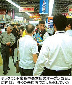 オープン当日は、雨にもかかわらず3500人以上の来店者が行列を作り、幸先の良いスタートを切った。ヤマダ電機の都市型出店は、紙屋町周辺に店を構える多くのパソコン専門店や家電量販店がかなりの衝撃を受けている。(佐相彰彦)