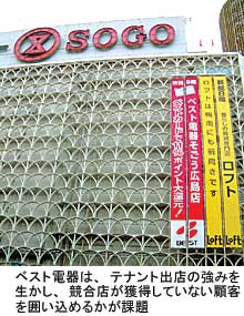 ベスト電器では、そごう広島店が「広島県のマーケットシェアを高める戦略的な店舗」(小野浩司・取締役中国地区担当部長兼広島本店店長)になっており、「広島県のマーケットシェア10%前後を、04年度(05年2月期)末までに15%まで引き上げる」(同)方針を固めている。
