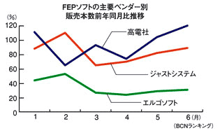 高電社の中国語入力用FEPソフト「チャイニーズライター7」は、実売価格が2万円以上と高額であるにもかかわらず、中国語需要の拡大が追い風になって販売増に転じた。国内企業が中国市場に目を向けており、中国語の入力に関する需要の高まりが前年同月比でプラスに押し上げる遠因にあるようだ。昨年12月に中国語入力に関するガイドブックを製品に添付して製品の取り扱いを分かりやすくしたこともユーザー層の拡大に結びついた。