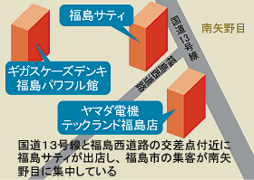 福島市で来店者数を増やしているのは、ヤマダ電機とギガスケーズデンキ。百貨店のマイカルが住宅地の南矢野目に大型店舗の福島サティを出店。南矢野目付近の住民の多くは週末になると福島サティに買い物に出かける。