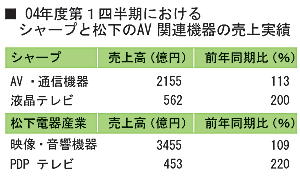 ■夏商戦で拡販に拍車かかる 松下電器産業は、04年度第1四半期の連結業績で、売上高が2兆1020億円(前年同期比19.2%増)、営業利益が前年同期比2.2倍の435億円、税引前利益で同3.2倍の805億円、最終利益で同12.1倍の328億円と大幅な増益を果たした。、PDPテレビ「ビエラ」の好調が業績アップのけん引役の1つとして挙げられる。同製品の売上高は453億円と、前年同期の2.2倍に伸びた。主力のAVCネットワーク分野は、売上高が8353億円(同0.8%減)と減少したものの、映像・音響機器で売上高が3455億円(同9.3%増)と増加している。