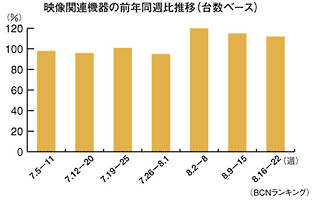 映像関連機器市場が拡大している。BCNランキングによると、直近の8月16-22日は台数ベースで前年同週の112%になった。ユーザーにとっては、AV(音響・映像)機能搭載パソコンよりも総合的に安い価格で、テレビチューナーボードやテレビキャプチャボックスを購入してパソコンでテレビ放送が楽しめるほか、ネットワークメディアプレイヤーでパソコンに保存した画像・映像などをテレビで見ることが可能になる。