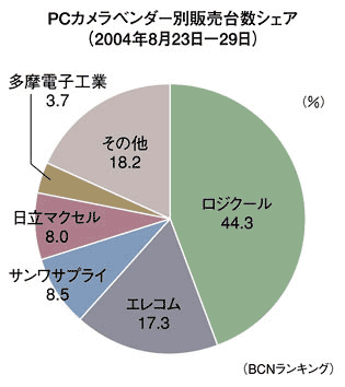 PCカメラ製品の2極化が進んでいる。解像度が10万画素クラスの廉価製品を主力にシェアを伸ばすメーカーがある一方で、解像度を30万画素クラスに高め人の顔の動きを追跡できる機能などを追加したモデルを中心として、販売単価アップを目指すメーカーもある。BCNランキング8月23日-29日のPCカメラ部門の週次販売台数シェアではロジクールが44.3%とトップを占め、エレコムが17.3%、サンワサプライが8.5%、日立マクセルが8.0%と続く。金額シェアで見ると、ロジクールが49.1%、エレコムが10.9%、日立マクセルが5.7%、サンワサプライが5.2%となり、ロジクールの金額シェアの高さが目立つ。