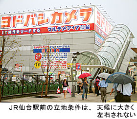 そこで97年にメインの店舗を東口の駅前に移し、マルチメディア仙台としてオープン。これが東北6県におけるヨドバシカメラの知名度アップにつながったという。現段階でも、デンコードーの知名度が地元住民に根付いてはいるものの、マルチメディア仙台が駅前で家電などを気軽に購入できることをユーザーにアピール、結果的に多くの来店者を獲得するようになったわけだ。
