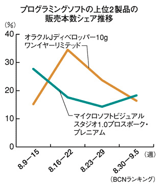 ソースネクストと日本オラクルが、1980円の低価格を“売り”に7月23日に発売開始したJava開発者用ソフトウェア「オラクルJディベロッパー10gワンイヤーリミテッド(10g)」が、プログラミングソフト部門の機種別販売本数シェアで週次のトップを獲得するようになった。直近の4週間のうち2週間では、マイクロソフトの.NET開発者用ソフト「マイクロソフトビジュアルスタジオ.NET(VS)」シリーズの各ソフトを抜き、トップシェアに踊り出ている。