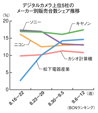 デジタルカメラ市場で、松下電器産業のシェアが急拡大している。直近のBCNランキング週次データ(9月6-12日)では、メーカー別販売台数シェアでキヤノンに続き2位へと浮上した。図は、BCNランキング週次データをもとに、最近約1か月間のメーカー別台数シェア推移を表した。松下を2位へと押し上げたけん引役は、8月27日に発売した同社初のカード型デジタルカメラ「DMC-FX7」と「DMC-FX2」だ。両製品投入前の週(8月16-22日)では、台数シェア2.7%で10位に甘んじていたが、投入後にシェアは急拡大。直近の週次データでは、台数シェア14.64%、金額シェア17.61%を獲得している。