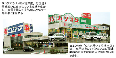 沼津市を本拠地とするパソコン専門店のZOAが「OAナガシマ沼津本店」(沼津市大諏訪)を構えており、家電量販店のコジマが「NEW沼津店」(沼津市東熊堂)、ノジマがパソコン関連機器やゲーム関連機器を販売する「沼津店」(沼津市寿町)などを出店している。沼津市で白物を中心に家電機器の販売で確固たる地位を築いているのはコジマ。NEW沼津店は、国道1号線沿いにあり、車での来店客が多い。また、店内で通路のスペースを広く確保してベビーカーがすれ違えるようにしていることなどで、土日や祝日になると30歳代のファミリー層が多く来店する。現金還元という低価格戦略によって、来店者は単価の高い大型家電機器を購入する傾向が高いという。さらに、営業時間が10時から21時までと、競合店より開店している時間が長いことで、平日に会社帰りのビジネスマンが来店したり、近隣に住む主婦層が夕食後に乾電池など消耗品を購入するなど、便利さが受けている。
