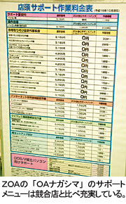サポートは、ZOAの店舗で購入したパソコンに「1年保証」(価格は9900円から)と「3年保証」(同1万9800円から)の2つのコースを設けており、25種類以上のサポートメニューを用意した。サポート会員になれば、パソコンの初期設定やパソコンの診断などが受けられる。インターネット関連およびワイヤレス機器への接続設定やパソコン関連の操作指導は別立てで1件あたり1050円に設定した。オプションの「パーフェクト保証」(同9900円)を追加すれば、メモリやHDD(ハードディスク)などの取り付けも行う。インターネット通販や競合店舗で購入したパソコンに関してもサポートを提供。価格は、1年コースが1万4900円(パーフェクト保証なし)、3年コースが2万4800円(同)。
