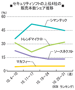 セキュリティソフトの新バージョンが大手セキュリティソフトベンダー各社から出揃った。上位4社の新製品がすべて出揃った10月下旬でも、順位の変動は見られず、依然シマンテックがトップシェアを堅持した。