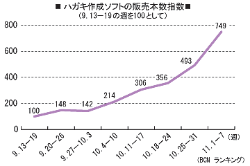 図は、BCNランキングによるハガキ作成ソフトの販売本数指数を表した。メーカー各社が冬商戦向け製品の販売を順次始めた9月13-19日の販売本数を100とした。市場は、週を追うごとに拡大しており、11月1-7日は749にまで達している。