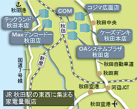 秋田県秋田市では、JR秋田駅の東地区で家電量販店の競争が繰り広げられてきたが、西地区にヤマダ電機やデンコードーが出店し、最近では秋田市全体で顧客争奪戦が激化している。