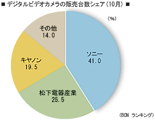 図は、BCNランキングの10月月次データをもとに、デジタルビデオカメラのメーカー別販売台数シェアを表した。