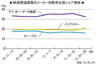 映像関連機器市場は、アイ・オー・データ機器が首位をキープしている。BCNランキングによれば、11月22-28日のメーカー別販売台数シェアで同社が32.5%を獲得。2位のバッファローに10ポイント以上の差をつけている。