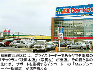 西地区では、ヤマダ電機が低価格を武器に勢力を伸ばしており、デンコードーはサポートの充実でリピーター増に力を注いでいる。両店舗とも国道7号線と山王大通りが交差する臨海十字路付近に店を構えている。2つの店は歩いて5分程度しか離れていない。土日にはファミリー層を中心に新規ユーザーの来店を狙って顧客争奪戦が繰り広げられる。しかし、〝プライスを重視した顧客はヤマダ電機へ、サポートを求める顧客はデンコードーへ〟と、買い物客の指向性も見えてきた。