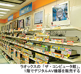 10月22日にリニューアルしたラオックスの旗艦店「ザ・コンピュータ館」では、1階フロアで薄型テレビやDVDレコーダーを展示。これまでのビジネスマンを中心としたパソコン中級者層以上に向けた店舗作りを一新し、パソコンに馴染みの薄い初級者でも気軽に来店できるように工夫した。ソフマップは、電気街入り口近くの中央通り沿いに店を構える「東京・秋葉原1号店Chicagoパソコン・デジタル館」のリニューアルをこのほど完了。1フロアの1コーナーだけだったデジタルAV機器の売り場を2階のフロア全体に広げた。しかも、DVDレコーダーを中心に同社が得意とする中古デジタルAV機器の品揃えを充実させたのが特徴だ。