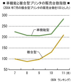 図はBCNランキングの月次データをもとに、単機能と複合型の販売台数を指数化して示した(2004年7月の複合型プリンタの販売台数を100とした)。