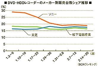 BCNランキングによれば、05年2月14-20日のメーカー別販売台数シェアではソニーが18.8%を獲得。昨年11月に販売を開始した「スゴ録」シリーズがユーザーから好評を得ている。機種別販売台数シェアでは、同シリーズの「RDR-HX50」が6.9%でトップ、「RDR-HX70」が4.7%で2位にランクインしている。