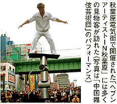 東京都・ヘブンアーティスト運営委員会の主催で、審査で選定した大道芸人に活動の場を提供する「ヘブンアーティストIN秋葉原」が3月20日に行われた。休日に歩行者天国となる電気街内の中央通りを会場とし、「石丸電気本店」や「オノデン本館」、「ソフマップ秋葉原1号店Chicagoパソコン・デジタル館」、「サイバースポット」、「ヤマギワ東京本店」などの前で12組のアーティストがパフォーマンスを繰り広げた。秋葉原電気街振興会が共催、千代田区が後援、イベント当日の運営を日本音楽映像ボランティアセンターが協力した。