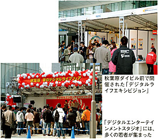 今回のイベント、秋葉原電気街振興会が主催者となり、秋葉原ダイビル近くの「駅前広場」に特設ステージを設置して実施した「デジタルエンターテインメントスタジオ」や、ビル前で「デジタルライフエキシビジョン」を設けてパソコンおよび関連機器メーカーによる新製品を展示したことが大きい。