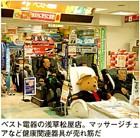商品は、高齢者に人気が高いマッサージ機や健康状態を自らチェックできる血圧計、歩数計の品揃えを充実させている。健康関連機器の売り場では、大型テレビを見ながらマッサージ機を体験したり、くつろぎながら商品を体験できるコーナーを設ける工夫も。パソコンの販売では、店内で定期的にパソコン教室を開催し、購入者を増やしている。パソコンおよび関連機器の売上比率は全体の25%弱。「パソコンを販売すれば、用途提案で周辺機器やサプライ品の販売増につながり、利益が増える」と、商品についてもユーザーへの浸透を図っている。(佐相彰彦)