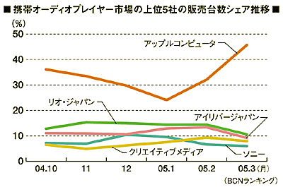 図は、BCNランキングの月次データをもとに、携帯オーディオプレーヤー市場の上位5社の販売台数シェア推移を表した。徐々にシェアを落としていたアップルだが、2005年に入ってからシェアは再び上昇。直近3月のデータでは、台数シェア45.71%を確保し、シェア2位のリオ・ジャパンに約35ポイントの差をつけた。