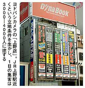 上野地区や近隣の地域では競合店がないというヨドバシカメラの上野店。だが、ビックカメラが3月10日にJR常磐線の柏駅前に大型店舗をオープンした。当然、意識せざるを得ない。「上野の地元住民だけでなく、JR常磐線を利用して柏や取手から訪れるユーザーも多い」ためだ。春商戦はポイント還元率をアップするなど、特別キャンペーンを実施し、現段階では売上高にダメージを受けていない。もっとも、「今後は来店者数が減少する危険性もある」と危機感を募らせる。