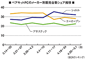 BCNランキングによれば、春商戦が終盤を迎える4月4-10日まではAOpen(エーオープン)がメーカー別台数シェアで30%以上をキープして首位の座にあった。キューブ型の「XCキューブEZ65」を主力製品とし、「XCキューブEZ661Lシルバー」やスリム型の「A2845-P」などの販売が好調だったためだ。
