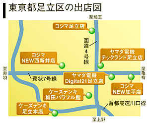 足立区は、人口が62万人超と東京都のなかでは5番目に大きい。加えて、JR常磐線や東武伊勢崎線、地下鉄日比谷線などが集まる北千住駅から埼玉寄りの地区では、最寄りの量販店が自宅から遠いなどの理由から休日にはマイカーを利用して買い物に出かけるケースもあるようだ。しかも、国道4号線を使って埼玉県の八潮市や草加市などからも買物客が訪れている。車による高集客地区である点からも、大手家電量販店が揃って店を構えている激戦区というわけだ。
