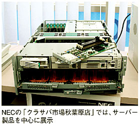 NECはかつて「クラサバ市場」というネーミングの展示会を秋葉原で開催したことがある。この展示会が「ユーザー企業やパートナーから予想以上に好評だった」(本永実・クライアント・サーバ販売推進本部マネージャー)ことから、製品展示を中心とした直営店の名称に引き継がれた。不定期のイベントでなく、常設のショールームをつくった方がユーザー企業やパートナーの受けはいい。クラサバ市場秋葉原店は、“こだわり商品”と位置づけた、最新技術を駆使したサーバーを中心に展示。加えて、NEC社員がスタッフとして顧客企業からのシステム導入に関する問い合わせに対応する。