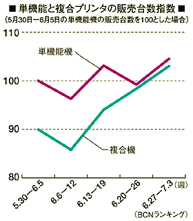 単機能プリンタの出荷台数は週によって好不調の波があるが、複合プリンタはここにきて上り調子。5月30日-6月5日の週には指数値で約20ポイントもの開きがあったが、6月27日-7月3日の週には1.5ポイントまで差が縮まった。複合プリンタが、夏のボーナス商戦で一気に単機能プリンタに迫ったことがみてとれる。
