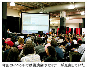 その勢いを反映してか、今年のイベントは近年にない盛況ぶりだった。数多く行われた基調講演やセミナーは充実。ここ数年はややアップルコンピュータとは距離を置いていた感のあるアドビシステムズやクオークなどの大手ソフトウェアメーカーも大規模なセミナーを実施した。リリースされたばかりの新OS「Mac OS X タイガー」についての講習会も多く開催されていた。もちろんグラフィックス分野や、iPodによって優位性を増した音楽制作関係分野で、アップルコンピュータの地位は秀でており、会場内ではあちこちで積極的なデモが繰り返されていた。
