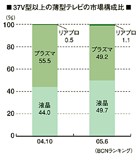 薄型テレビ市場(液晶、プラズマ、リアプロジェクションテレビ)で、液晶テレビが台頭している。BCNランキングによる6月の32V型以上の薄型テレビを見ると、液晶が78.7%、プラズマが20.9%、リアプロジェクションが0.4%となっており、液晶が圧倒的なシェアを確保している。