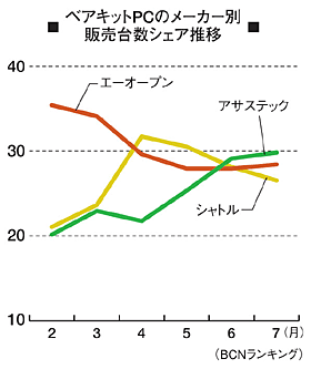 マザーボードと電源、PCケースがセットになったベアキットPCの店頭販売は、ASUSTek(アサステック)とAOpen(エーオープン)、Shuttle(シャトル)の上位3社が激しいシェア争いを繰り広げている。BCNランキングによると、今年7月のメーカー別販売台数シェアは、アサステックが29.8%のシェアでトップ。続いてエーオープンが28.4%、シャトルが26.5%となった。
