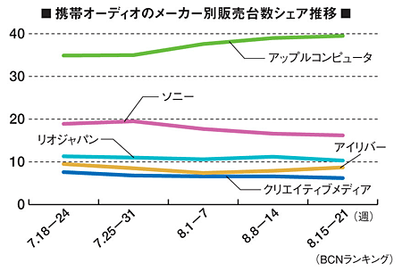 携帯オーディオ市場で独走を続けているアップルコンピュータが、ここにきてさらに競合を引き離し始めた。図は、BCNランキング週次データをもとにメーカー別販売台数シェア上位5社の推移を表した。