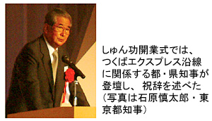 これまでの鉄道と異なる点は、日本を“IT技術立国”として確立させる要の1つになるとの呼び声が高いことだ。開通に先立って行われた「しゅん功開業式」では、石原慎太郎・東京都知事が来賓挨拶として登壇。「日本最大で、しかも世界に類をみない電気街がある秋葉原と、研究学園都市のつくばがダイレクトにつながることは非常に大きな意味を持つ」と述べたうえで、「終戦後、電気街はラジオなどの部品を売る店が軒を並べ、今でもその面影が残っている。一方、つくばは最新技術を開発するための研究者が多い。“ものづくり”の原点を持った街と、最新技術を開発する街のコラボレーションにより、日本が“IT技術立国”となることは、そう遠くはない」と言い切った。