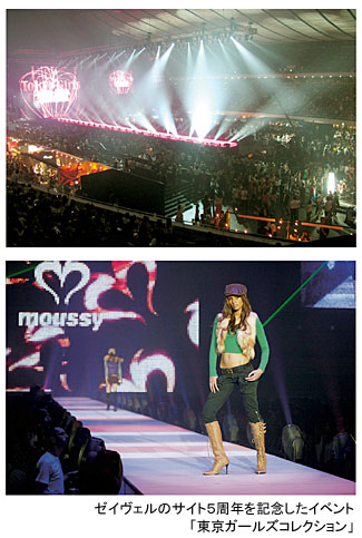 Eコマース事業を展開するゼイヴェル(大浜史太郎社長)は、00年6月から携帯電話でのF1世代向けポータルサイト「ガールズウォーカードットコム」を展開し、女性向けサイトで日本最大級の900万人強の会員登録を誇っているが、8月7日、サイト5周年を記念して、東京・原宿の国立代々木競技場第一体育館でファッションフェスタ「東京ガールズコレクション」を開催した。