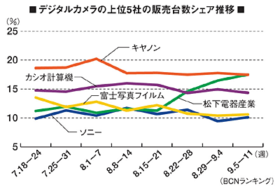 デジタルカメラ市場で、トップの座を維持してきたキヤノンに松下電器産業が競り勝ち、首位に立った。図は、BCNランキング週次データをもとに、直近約2か月間の上位5社の販売台数シェア推移を表した。松下電器は、7月18-24日の週では台数シェア11.2%で4位に位置していたが、直近の週(9月5-11日)では、シェアを6.3ポイント上げ、トップに躍り出た。