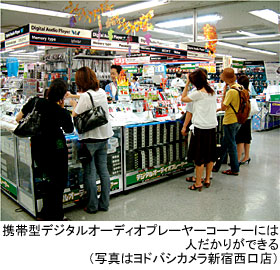 ヨドバシカメラによると、携帯オーディオの販売は「前年比2倍の売れ行きで、若年層から中高齢層まで幅広く売れている」という。「どちらかといえばメモリタイプの方が小型、軽量のため売れており、HDDタイプは音楽を聴く以外の用途で購入しているケースが多い」と分析している。