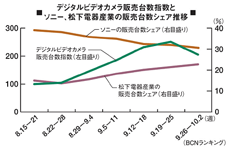 ソニーがシェアを落としたのは、松下電器の販売台数伸長が原因。松下電器は9月12日の週に2位を獲得し、販売台数を伸ばしている。9月26日の週には、首位のソニーとの差を7.9ポイントまで縮めた。