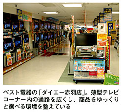 ベスト電器のダイエー赤羽店がある地区は、「東京都板橋区や埼玉県川口市など周辺地域の顧客が赤羽に訪れることは少ない」と、商圏は狭いという。その理由として、「JR赤羽駅や東京メトロの赤羽岩淵駅があり交通の便が良いので、地元の若い住民はショッピングに出かけるために都心まで足を運んでしまう」と、顧客が限られていることを挙げる。そこで、家庭の財布の紐を握る主婦が来店しやすい店づくりに専念したというわけだ。