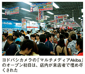 ヨドバシカメラのマルチメディアAkibaは、JR秋葉原駅の昭和通り口と首都圏新都市鉄道「つくばエクスプレス」の秋葉原駅に直結している。加えて、400台を収容できる駐車場を完備。電車でも車でも利用の便が良い。売場面積は、2万3800平方メートルと国内最大級。アイテム数は65万種類と電気街内のショップに比べて群を抜く。初年度の売上高は500億円規模を見込む。
