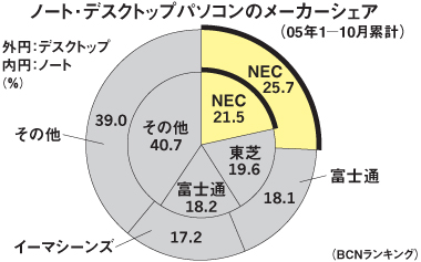 BCNランキングが年間販売台数ナンバー1メーカーを表彰する「BCN AWARD」の中間集計(05年1-10月)によれば、デスクトップパソコン部門、ノートパソコン部門ともに、NECがシェア1位を堅持している。とくに夏商戦が好調で競合を引き離した。