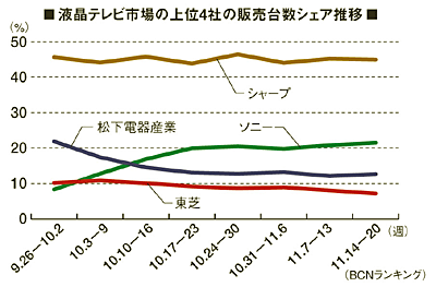 ただ、ソニーがシェアを伸ばした半面、松下電器産業や東芝がシェアを下げる構図にあるが、首位を独走するシャープのシェアは高水準にある。シャープは、一貫して台数シェア45%前後をキープし、製品別シェアでも上位4位までをシャープ製品が独占する。ブラビアは32V型のエントリーモデルが5位にランクインするのがやっとという状況だ。