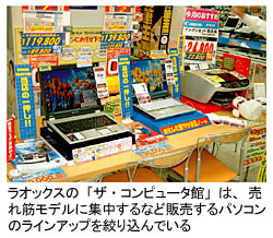 そうしたなかで、パソコンや薄型テレビなどデジタル情報機器の大型商材についてビジネスモデルを抜本的に見直す動きが出てきた。ラオックスは、「売れ筋モデルだけに絞っている」(山下巌広報IR室長)販売に切り替えた。今秋冬商戦は、メーカーが発売しているラインアップのなかから販売するモデルを30機種に抑えた。12月には、各ショップで“当店の一押しモデル”と称し、売れ筋モデルをさらに3機種に絞って集中的に販売することを徹底。これにより、パソコンの販売は、「台数が減少しているが、利益は前年を上回っている」との成果を収めつつある。