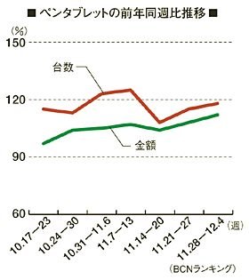 BCNランキングによれば、10月17-23日は販売金額が前年同週を下回っていたものの、10月24-30日以降は上回っている。11月28-12月4日は、台数で前年同週比18%増、金額で同12%増と大きく伸びた。これは、トップメーカーのワコムが秋冬商戦に向けて、ラインアップのほぼすべてをバージョンアップしたことが寄与している。最近は、タブレットコーナーを拡張する家電量販店やパソコン専門店が増えているのも事実。