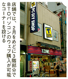 秋葉原電気街で組み立てパソコン用パーツ専門店が新しいビジネスモデルを構築する動きが出てきた。T・ZONEストラテジィは、今年2月をめどにBTOパソコンビジネスを本格的にスタートする。ウェブでの販売を中心に、パーツ専門店「T・ZONE. PC DIY SHOP」内にウェブ購入が可能なコーナーを設けるほか、注文を受け付けるサービスカウンターなどの設置を計画。「当社ならではの店頭BTOモデルを構築する」(岡本護取締役)考えだ。