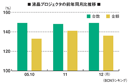 液晶プロジェクタの店頭販売が好調だ。台数は、直近3か月間連続で前年同月比1.4倍以上をキープした。大画面の薄型テレビやAV(音響・映像)機能付きパソコンなどの登場で映像ニーズがますます高まっており、趣味性が高く本格指向のホームシアターを好む層が液晶プロジェクタを購入するようだ。図は、BCNランキングで液晶プロジェクタの前年同月比を示したもの。05年冬商戦は、立ち上がりの10月に台数ベースで前年同月比49%増と1.5倍弱を記録、金額ベースで同33%増となった。11月に入っても勢いは衰えず、台数で同48%増、金額で同41%増。販売が最もピークに達する12月は、台数で同49%増、金額で同36%増という結果だった。
