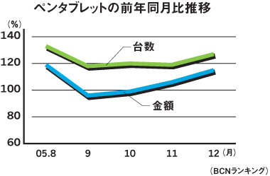 ペンタブレットの店頭販売は、台数と金額ともに2ケタ成長を達成している。BCNランキングによれば、05年12月は台数ベースで前年同月比27%増、金額ベースで15%増という結果だ。