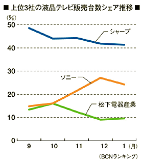 9月の時点で首位のシャープには33.6ポイントもの差をつけられ、松下電器産業と2位争いをするのがやっとだったソニーだが、その後、10月、11月、12月とシェアを徐々に伸ばしてきた。図で表している期間内で、12月は、ソニーとシャープとの差が14.7ポイントまで縮まった。