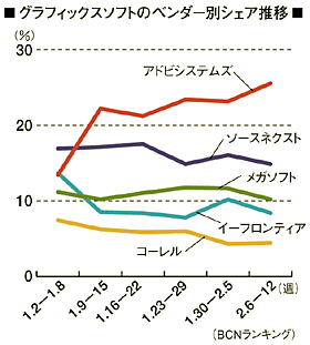 首位アドビの主力製品であるデジタル画像編集ソフト「Photoshop」シリーズに対し、コーレルが昨年10月に出した「Paint Shop ProX」は、今年序盤に善戦したものの、2月に入り勢いを落としている。一方、直近の週で「Photoshop」は高額版、廉価版ともに機種別シェアで10位以内に3機種が入っている。廉価版の画像編集ソフトとしては、初心者でもデジカメ画像の切り抜きをマウスだけでできるソースネクストの「Paintgraphic」シリーズも上位に位置し、同社の全体シェアを底上げするのに貢献している。
